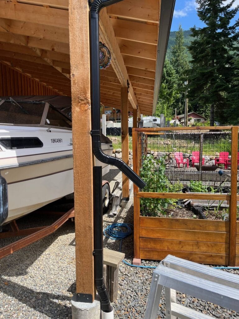 This downspout had a slip joint added to the middle. In the winter months, it can flow into the perimeter drainage. The rest of the year, a rain barrel can be filled with the roof runoff. The bottom of the…