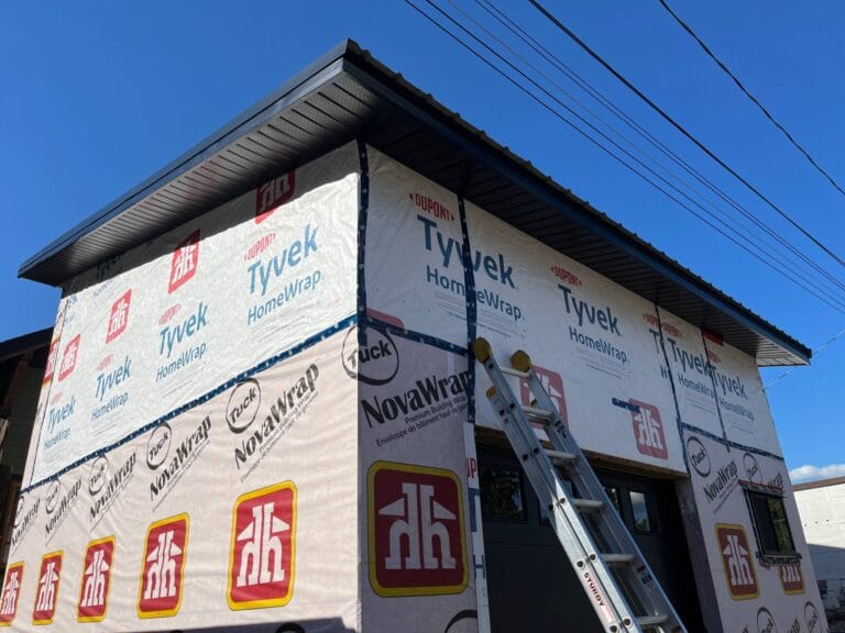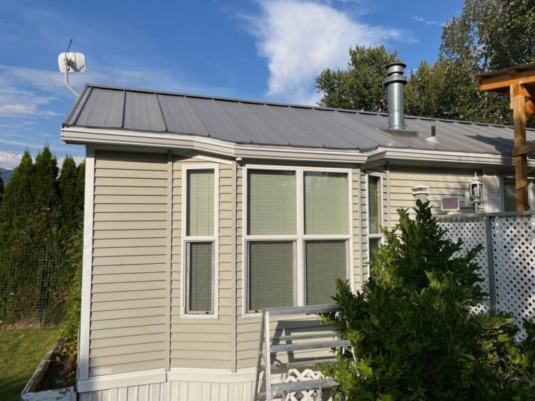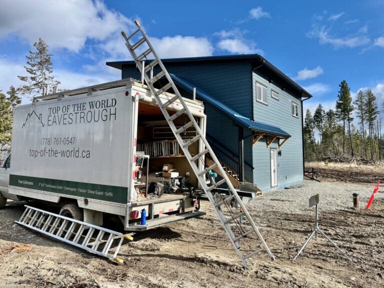 This 5″ eavestrough is made from a custom slit 24 gauge steel gutter coil. You can’t get a better match to a roof colour than making the gutter from a roof coil.