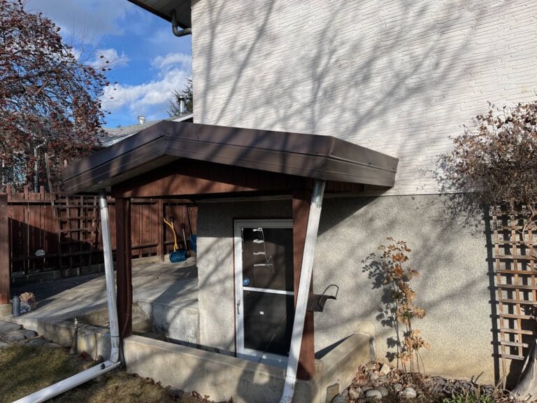 Before: The constant water drip was damaging the wood siding and impeding the door. Installation of a drip edge and fascia cover to cover the water marked wooden fascia. After: Eavestrough and downspout in place to direct water away from…